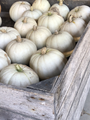 Thanksgiving Decorations: Small white pumpkins, and loads of mini pumpkin gourds in white and sunshine yellow.